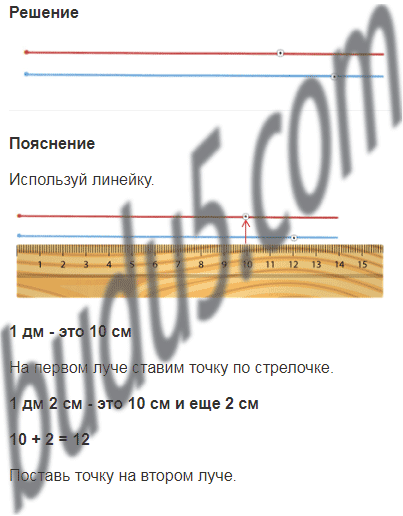 Поставь на лучах точки, чтобы получить отрезки длиной 1 дм и 1 дм 2 см.