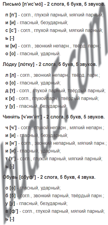 Не забудь провести фонетический разбор слов письмо, лодку, чинить, обувь.