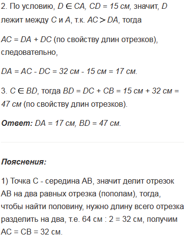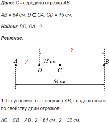 Точка С - середина отрезка АВ, равного 64 см. На луче СА отмечена точка D так, что CD = 15 см. Найдите длины отрезков ВD и DА.