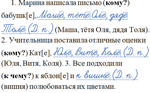 1. Марина написала письмо (кому?) бабушк[е], Маше, тёте Оле, дяде Толе (Д. п.) (Маша, тётя Оля, дядя Толя). 2. Учительница поставила отличные оценки (кому?) Кат[е], Юле, Вите, Коле (Д. п.) (Юля, Витя, Коля). 3. Все подходили (к чему?) к яблон[е] и к вишне (Д. п.) (вишня) полюбоваться их цветами.