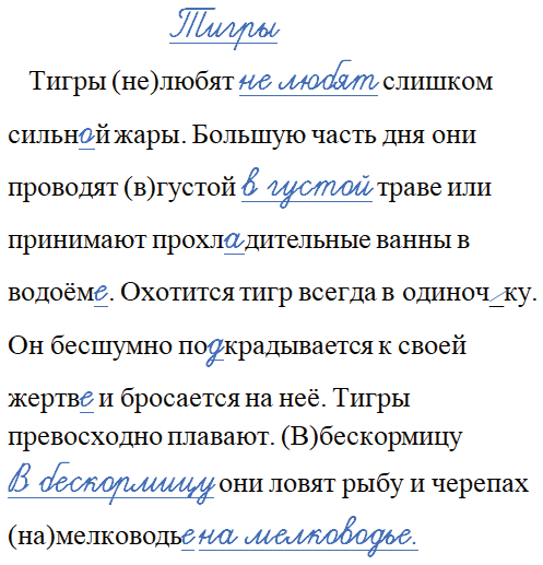 Тигры (не)любят не любят слишком сильной жары. Большую часть дня они проводят (в)густой в густой траве или принимают прохладительные ванны в водо-ёме. Охотится тигр всегда в одиноч_ку. Он бесшумно подкрадывается к своей жертве и бросается на неё. Тигры превосходно плавают. (В)бескормицу В бес-кормицу они ловят рыбу и черепах (на)мелководье на мелководье.