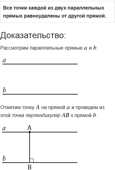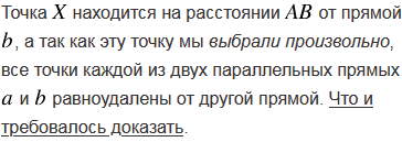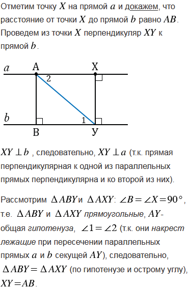 Докажите, что все точки каждой из двух параллельных прямых равноудалены от другой прямой.