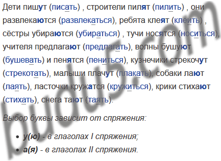 Дети пиш_т (______) , строители пил_т (______) , они развлека_тся (______), ребята кле_т (______) , сёстры убира_тся (______) , тучи нос_тся (______), учителя предлага_т (______), волны бушу_т (______) и пен__тся (______), кузнечики стрекоч_т (______), малыши плач_т (______), собаки ла_т (______), ласточки круж_тся (______), крики стиха_т (______), снега та_т (______).