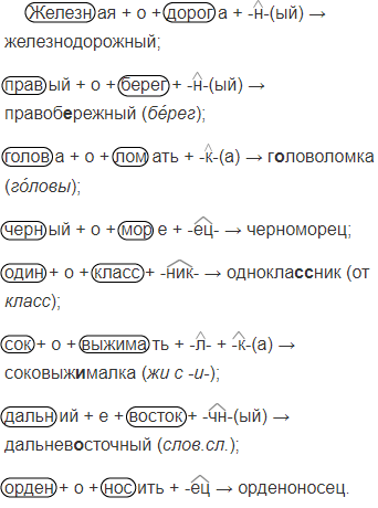 (Железно) дорожный, (право) б..режный, (г..лово) ломка, (черно) морей, (одно) клас..ник, (соко) выж..малка, (дальне) в..сточный, (ордено) носец.