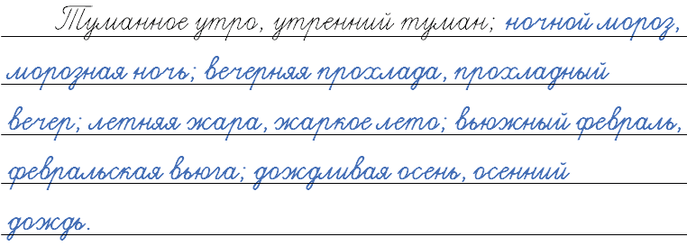 Туман, утро; ночь, мороз; вечер, прохлада; лето, жара; вьюга, февраль; дождь, осень.