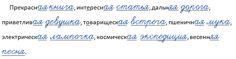 Прекрасн__ ___, интересн__ ___, дальн__ ___, приветлив__ ___, товарищеск__ ___, пшеничн__ ___, электрическ__ ___, космическ__ ___, весенн__ ___.