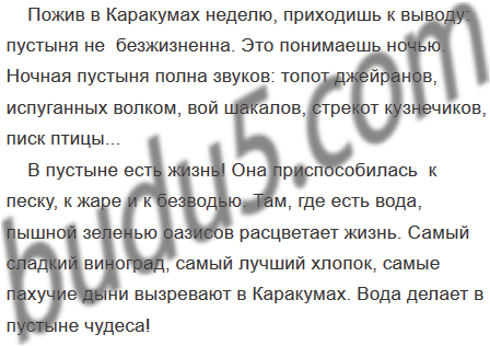 Есть жизнь в пустыне! Приспособилась она и к песку, и к жаре, и к безводью. Там же, где есть вода, жизнь расцветает пышной зеленью оазисов. В Каракумах вызревает самый сладкий виноград, самый лучший хлопок, самые пахучие и вкусные дыни. Чудеса делает вода в пустыне! (По В. Пескову)