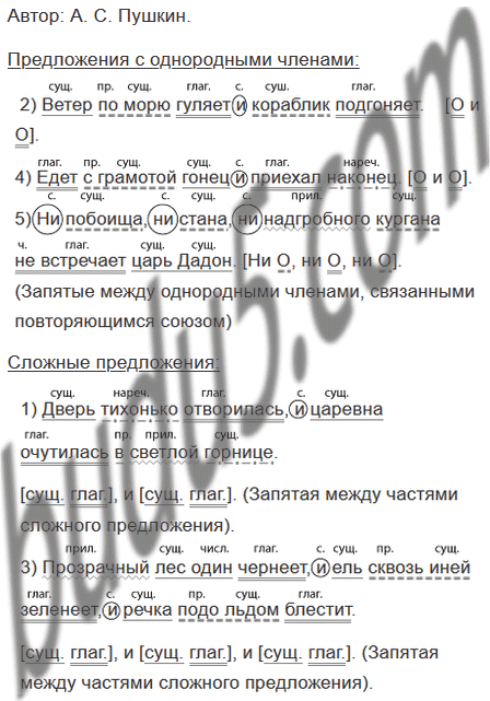 1) Дверь тихонько отворилась, и царевна очутилась в светлой горнице. 2) Ветер по морю гуляет и кораблик подгоняет. 3) Прозрачный лес один чернеет, и ель сквозь иней зеленеет, и речка подо льдом блестит. 4) Едет с грамотой гонец и приехал наконец. 5) Ни побоища, ни стана, ни надгробного кургана не встречает царь Дадон. 6) То солнце тусклое блестит, то туча чёрная висит.