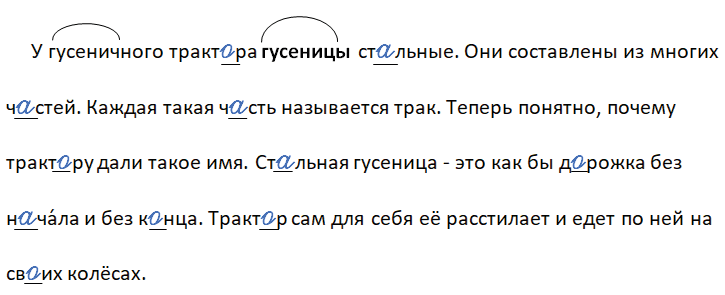 У гусеничного тракт_ра гусеницы ст_льные. Они составлены из многих ч_стей. Каждая такая ч_сть называется трак. Теперь понятно, почему тракт_ру дали такое имя. Ст_льная гусеница - это как бы д_рожка без н_ча́ла и без к_нца. Тракт_р сам для себя её расстилает и едет по ней на св_их колёсах.