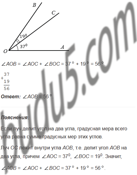 Луч ОС лежит внутри угла АОВ, причем АОС = 370, ВОС = 190. Чему равен угол АОВ?