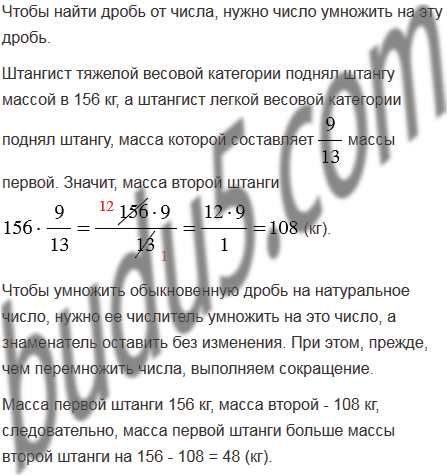 Штангист тяжелой весовой категории поднял штангу массой в 156 кг, а штангист легкой весовой категории поднял штангу, масса которой составляет массы первой. На сколько килограммов масса первой штанги больше массы второй штанги?