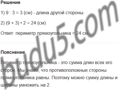 3. Найди периметр прямоугольника, у которого длина одной стороны 9 см, а другая сторона в 3 раза короче.
