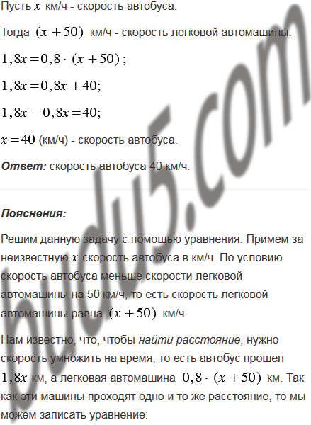 Автобус проходит расстояние от города до села за 1,8 ч, а легковая автомашина - за 0,8 ч. Найдите скорость автобуса, если известно, что она меньше скорости легковой автомашины на 50 км/ч.