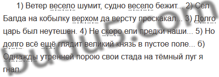 1) Ветер весело шумит, судно весело бежит... 2) Сел Балда на кобылку верхом да версту проскакал... 3) Долго царь был неутешен. 4) Не скоро ели предки наши... 5) Но долго всё ещё глядит великий князь в пустое поле... б) Однажды утренней порою свои стада на тёмный луг я гнал.