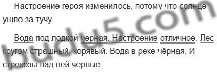 Я плыл по Ялме. Вода под лодкой чёрная. Над нею синие стрекозы перелетают. Настроение отличное. Вдруг стемнело над рекой. Солнце за тучу ушло! Куда же я забрался? Лес кругом страшный, корявый. Вода в реке чёрная. И стрекозы над ней чёрные. Ударил я веслом и повернул лодку к дому.