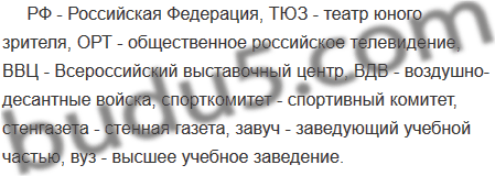 РФ, ТЮЗ, ОРТ, ВВЦ, ВДВ, спорткомитет, стенгазета, завуч, вуз.