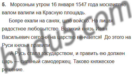 2) На санях ехали к площади бояре, торжественными, стройными рядами шло войско. На раскрасневшихся от мороза лицах радостное любопытство. Великий князь Иван Васильевич сегодня на царство венчается! Можно ли пропустить это? До этого на Руси князья правили.