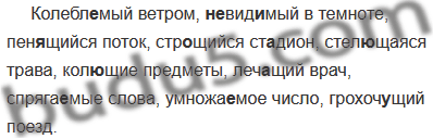 Колебл..мый ветром, (не)вид..мый в темноте, пен..щийся поток, стр..щийся ст..дион, стел..щаяся трава, кол..щие предметы, леч..щий врач, спряга..мын слова, умножа..мое число, грохоч..щий поезд.