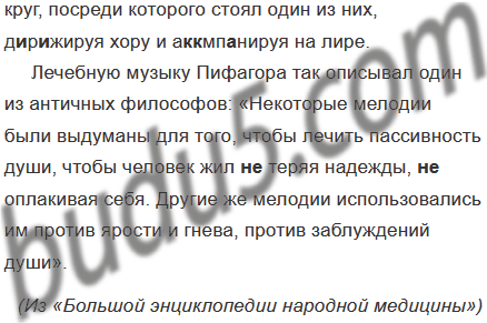 Лечебную музыку Пифагора так описывал один из античных философов: «Некоторые мелодии были выдуманы для того, чтобы лечить пассивность души, чтобы человек жил (не)теряя надежды, (не)оплакивая себя. Другие же мелодии использовались им против ярости и гнева, против заблуждений души».
