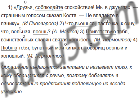 1) Друзья соблюдайте спокойствие! Мы в джунглях — страшным голосом сказал Костя. Не впадайте в панику. (И.Пивоварова) 2) Что вьёшься ласточка к окну, что вольная поёшь? (А. Майков) 3) Приветствую тебя воинственных славян святая колыбель. (М. Лермонтов) 4) Люблю тебя булатный мой кинжал, товарищ верный и холодный. (М. Лермонтов)