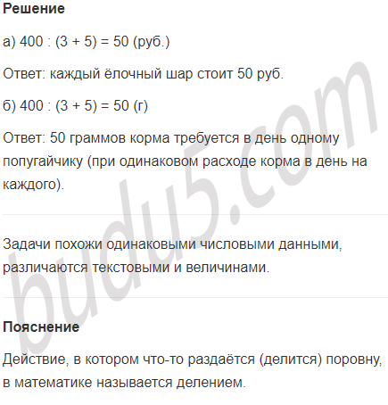 б) В живом уголке было 3 зелёных и 5 жёлтых попугайчиков. В день они вместе съедают 400 г корма. Сколько граммов корма требуется в день одному попугайчику (при одинаковом расходе корма в день на каждого)?