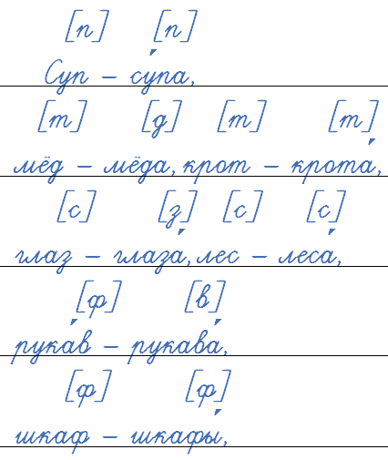 Если на конце слова пишется согласная буква, обозначающая звонкий согласный, то при произнесении слова на его месте появляется парный глухой согласный звук.