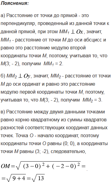 Найдите расстояние от точки М(3; - 2): а) до оси абсцисс; б) до оси ординат; в) до начала координат.