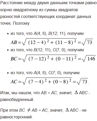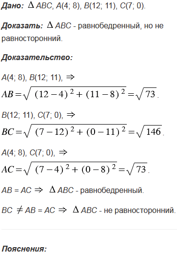 Докажите, что треугольник АВС, вершины которого имеют координаты А(4; 8), В(12; 11), С(7; 0), является равнобедренным, но не равносторонним.