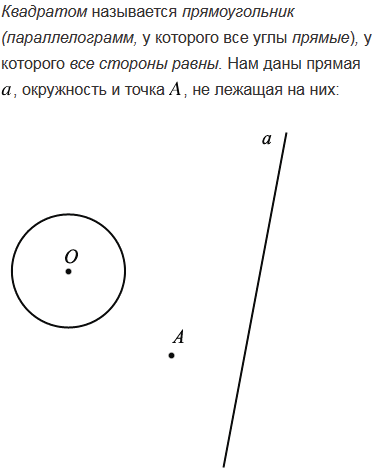 Даны прямая, окружность и точка А, не лежащая на них. Постройте квадрат ABCD так, чтобы вершина В лежала на данной прямой, а вершина D - на данной окружности.