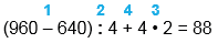 (960 - 640) : 4 + 4 • 2 = 88