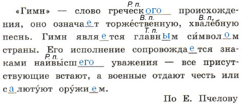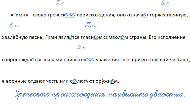 "Гимн" - слово греческ___ происхождения, оно означа_т торже́ственную, хвале́бную песнь. Гимн явля_тся главн_м си́мвол_м страны. Его исполнение сопровожда_тся знаками наивы́сш___ уважения - все присутствующие встают, а военные отдают честь или с_люту́ют ору́жи_м.
