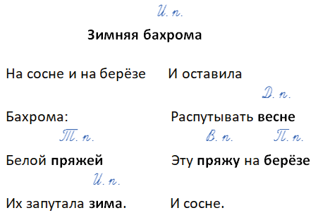 Все существительные в стихотворении первого склонения, потому что у них можно выделить окончание -а и все они являются существительными женского рода: бахрома, сосна, берёза, пряжа, зима, весна.