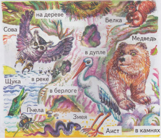 Устно скажи, где живёт каждое из этих жифотных. Например: